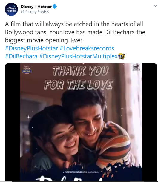 با تشکر از همه طرفداران Sushant Singh Rajput ، دیزنی پلاس Hotstar گفت: تا کنون. "